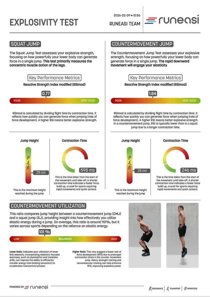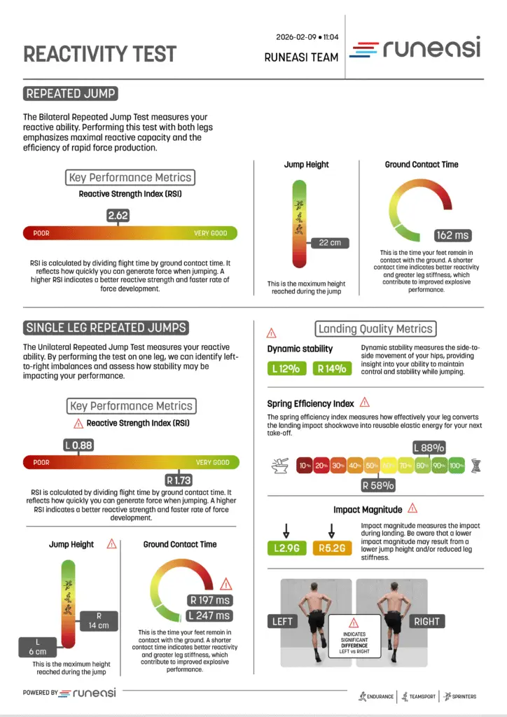 Perform explosivity tests (squat jump, CMJ) and reactivity tests (bilateral and unilateral hops) in just a few minutes.
