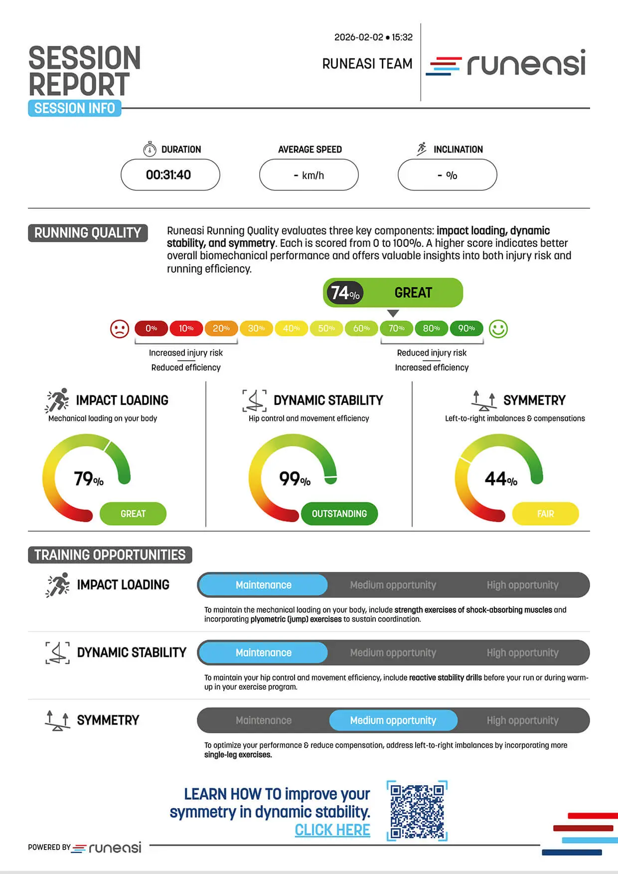 Strength training, (rehab) exercises, gait drills, (live) gait retraining feedback, as well as running volume, intensity, and pace zones can all be adjusted based on objective thresholds, ensuring safer progression and more efficient running.